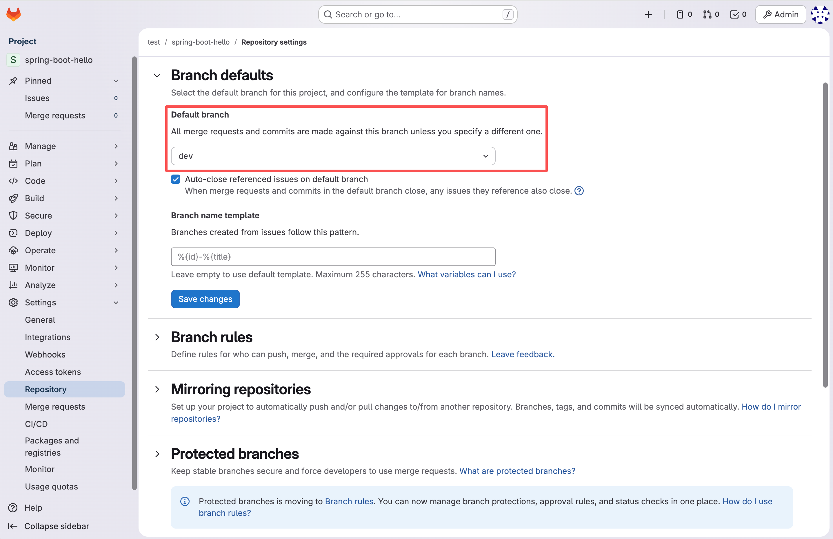 Project -> Settings -> Repository -> Branch defaults -> Default branch -> 选择 dev