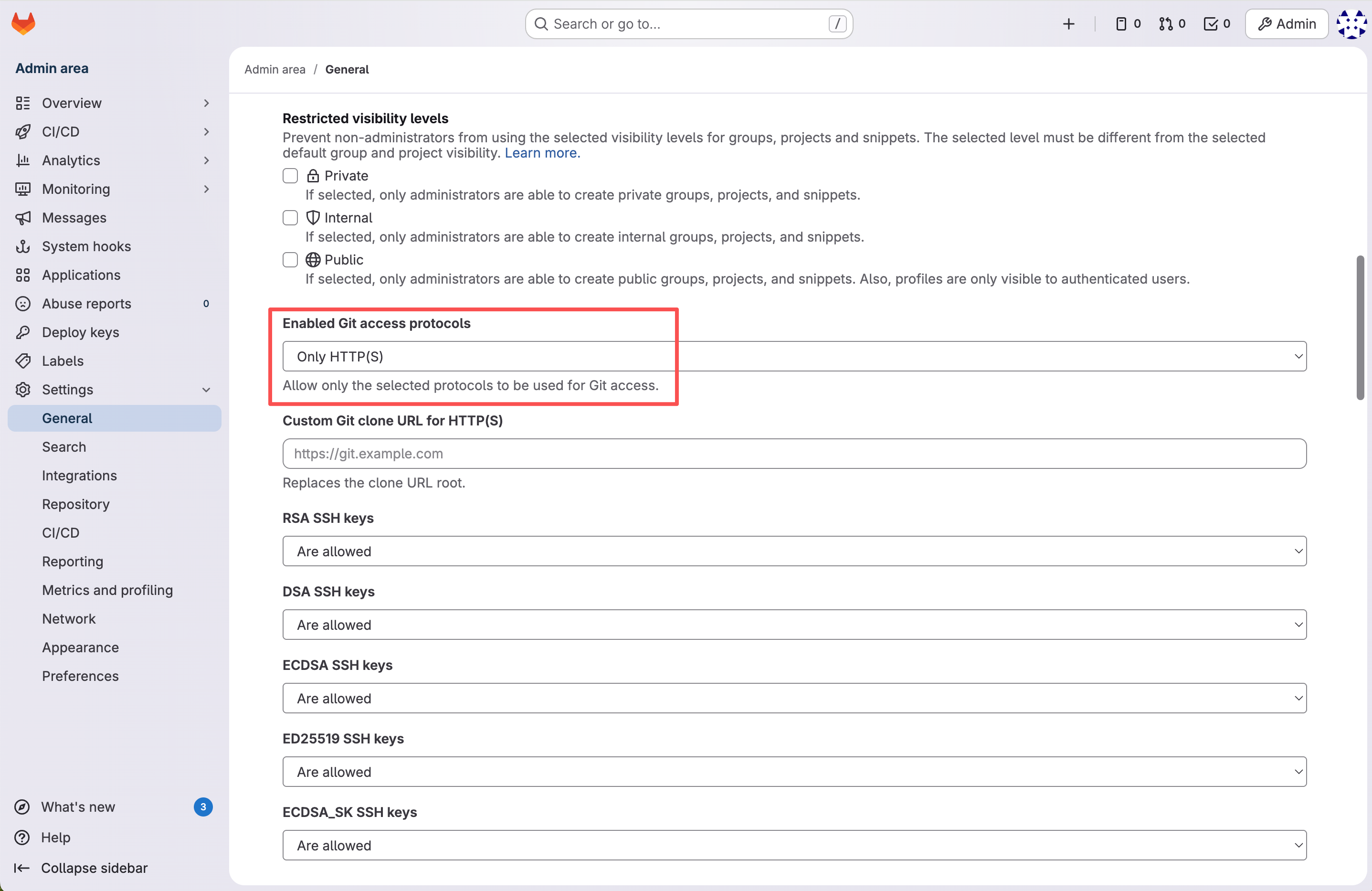 Admin area -> Settings -> General -> Visibility and access controls -> Enabled Git access protocols -> Only HTTP(S)