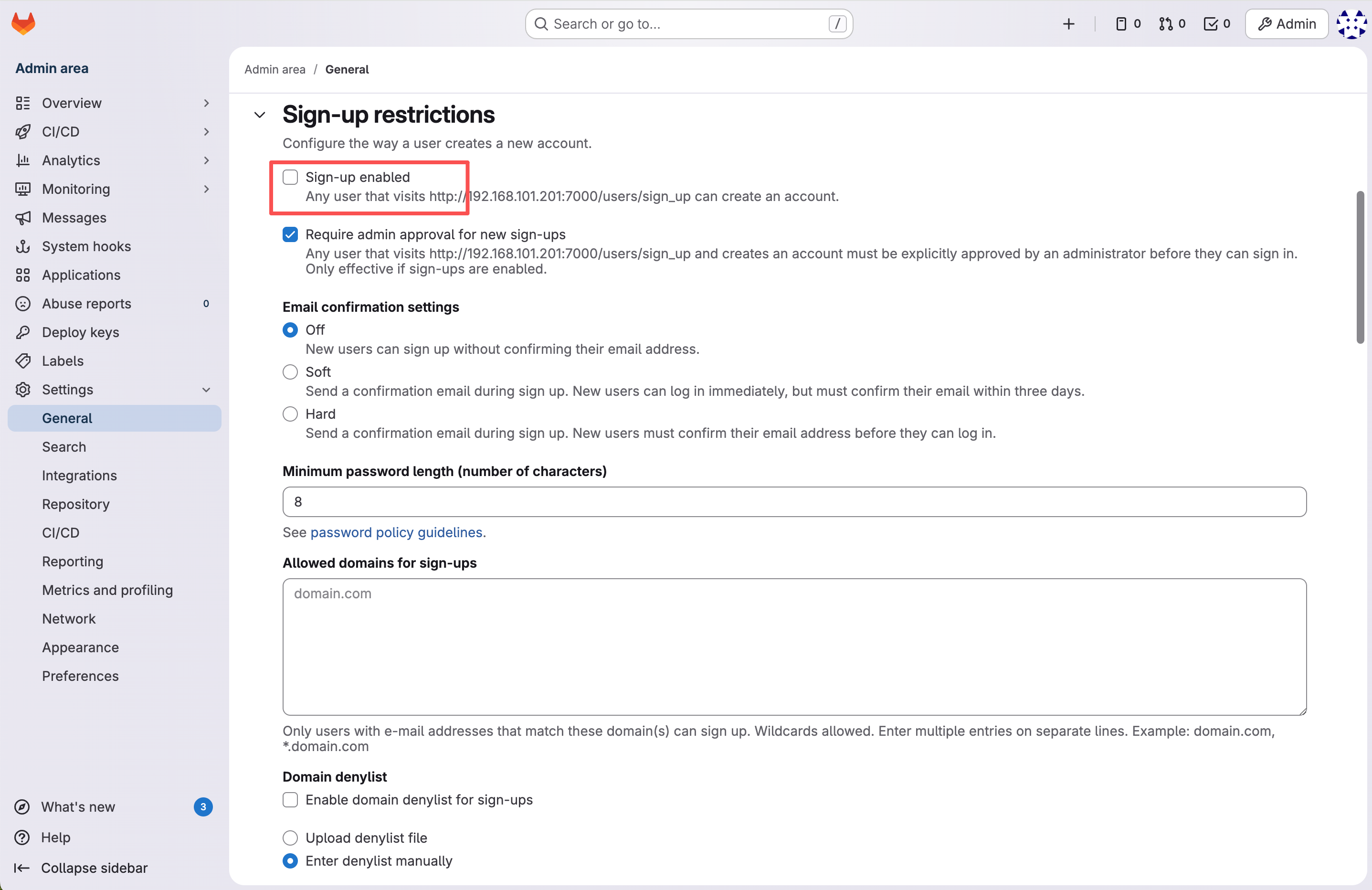Admin area -> Settings -> General -> Sign-up restrictions ->