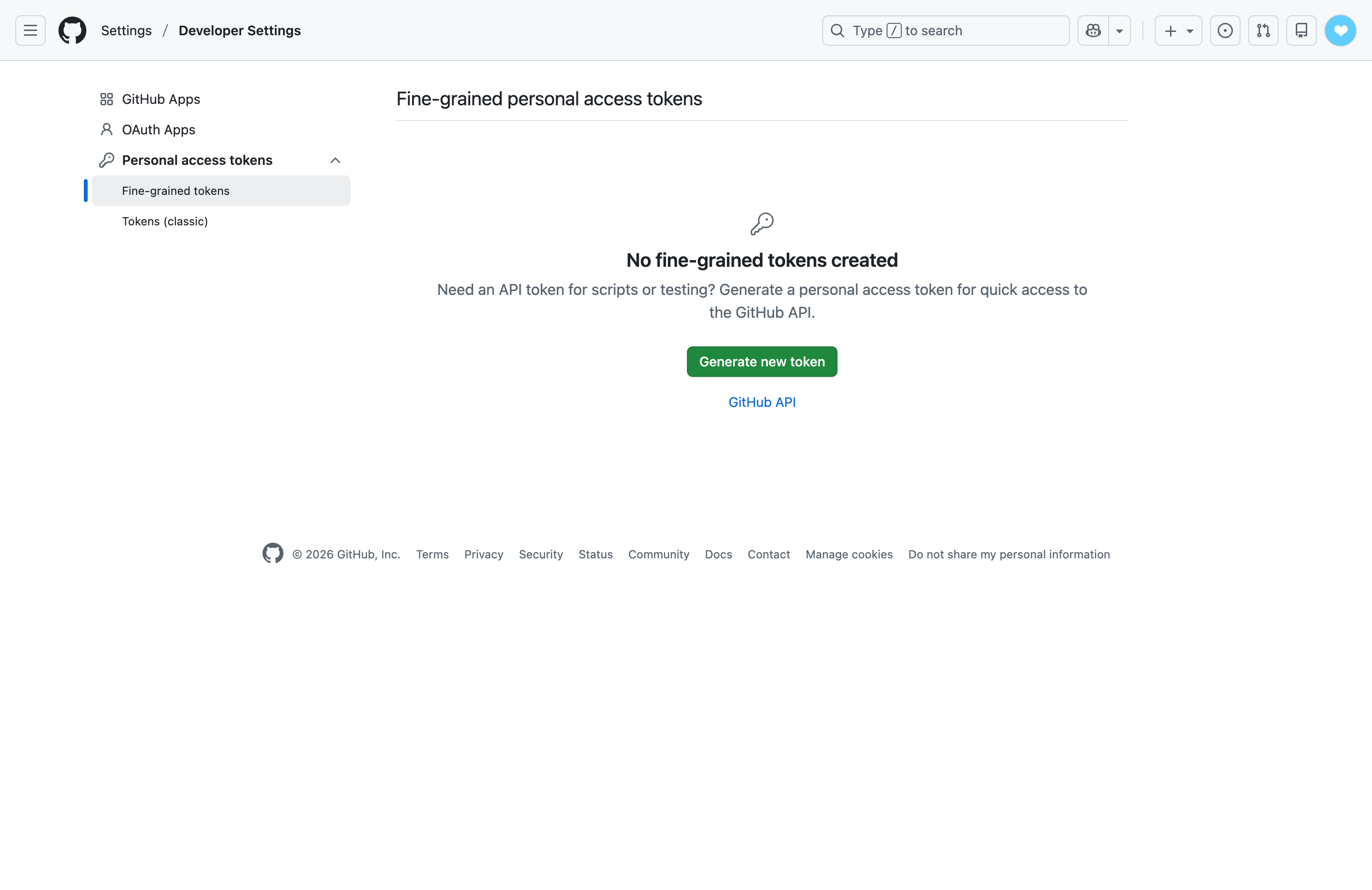 左侧菜单,选择 Personal access tokens -> Finer-grained tokens -> 点击 Generate new token