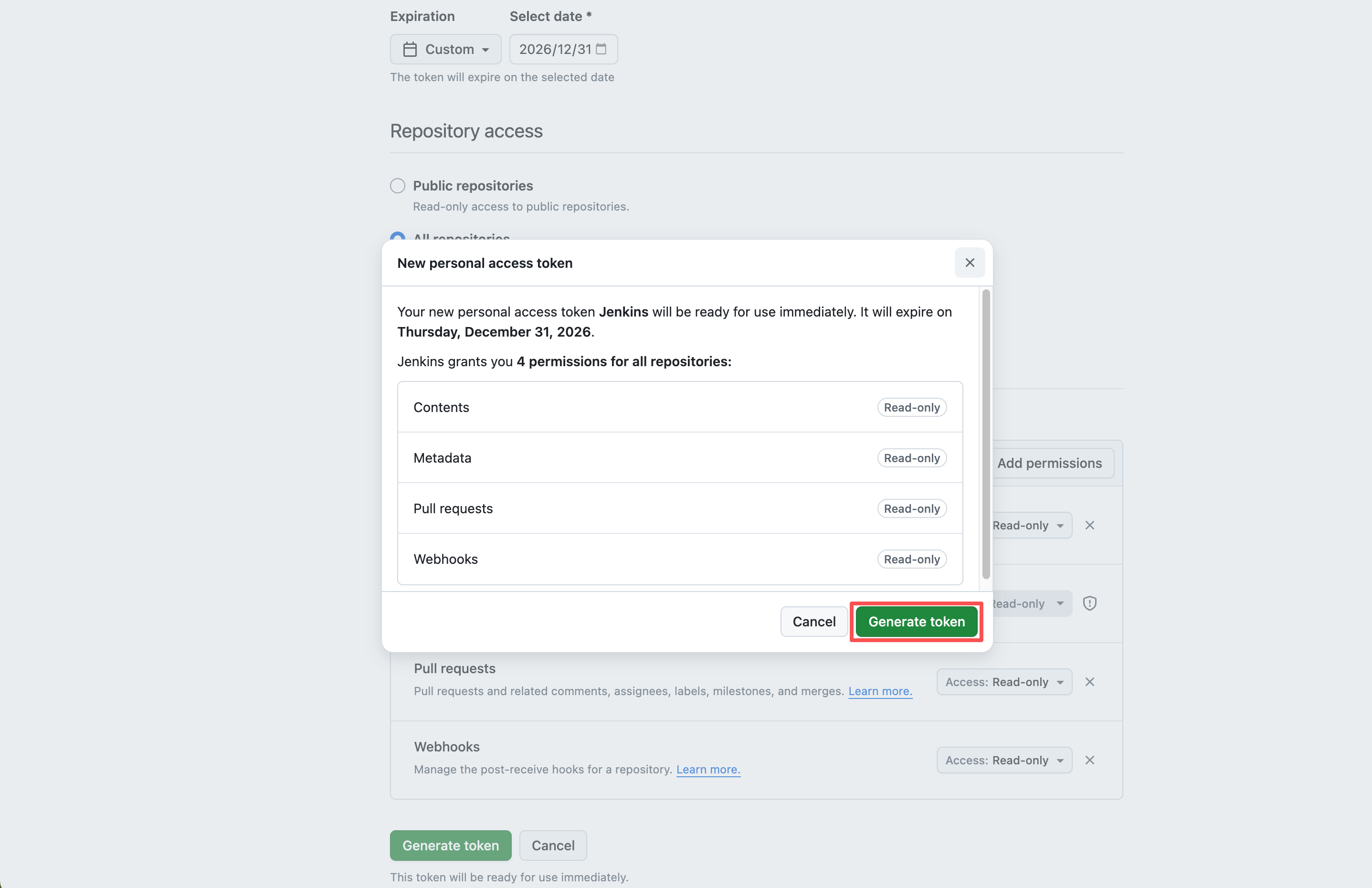 - Permissions -> Contents、Metadata、Pull requests、Webhooks -> 权限 Read-only