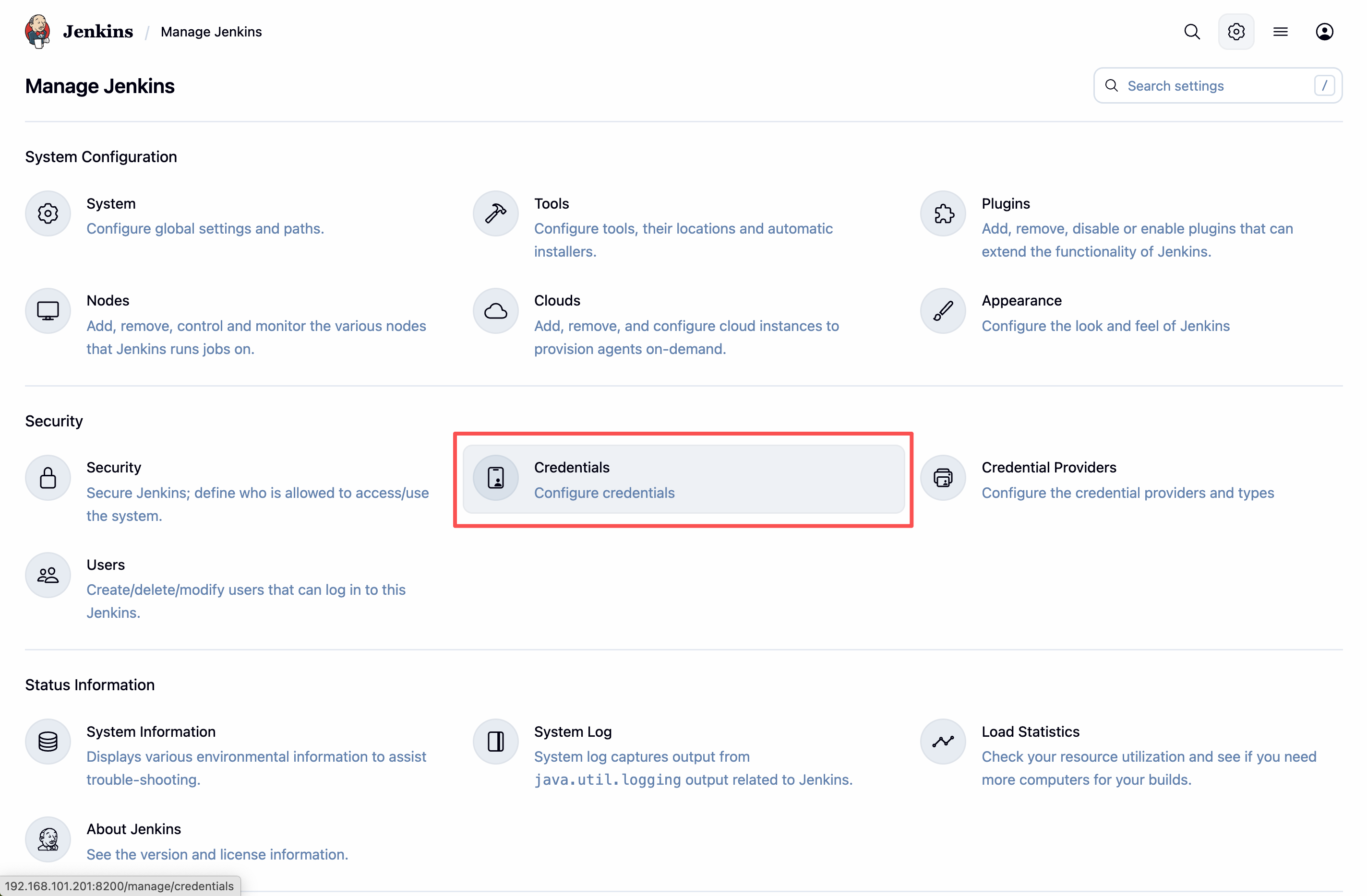 进入 Jenkins -> Manage Jenkins 点击 Credentials