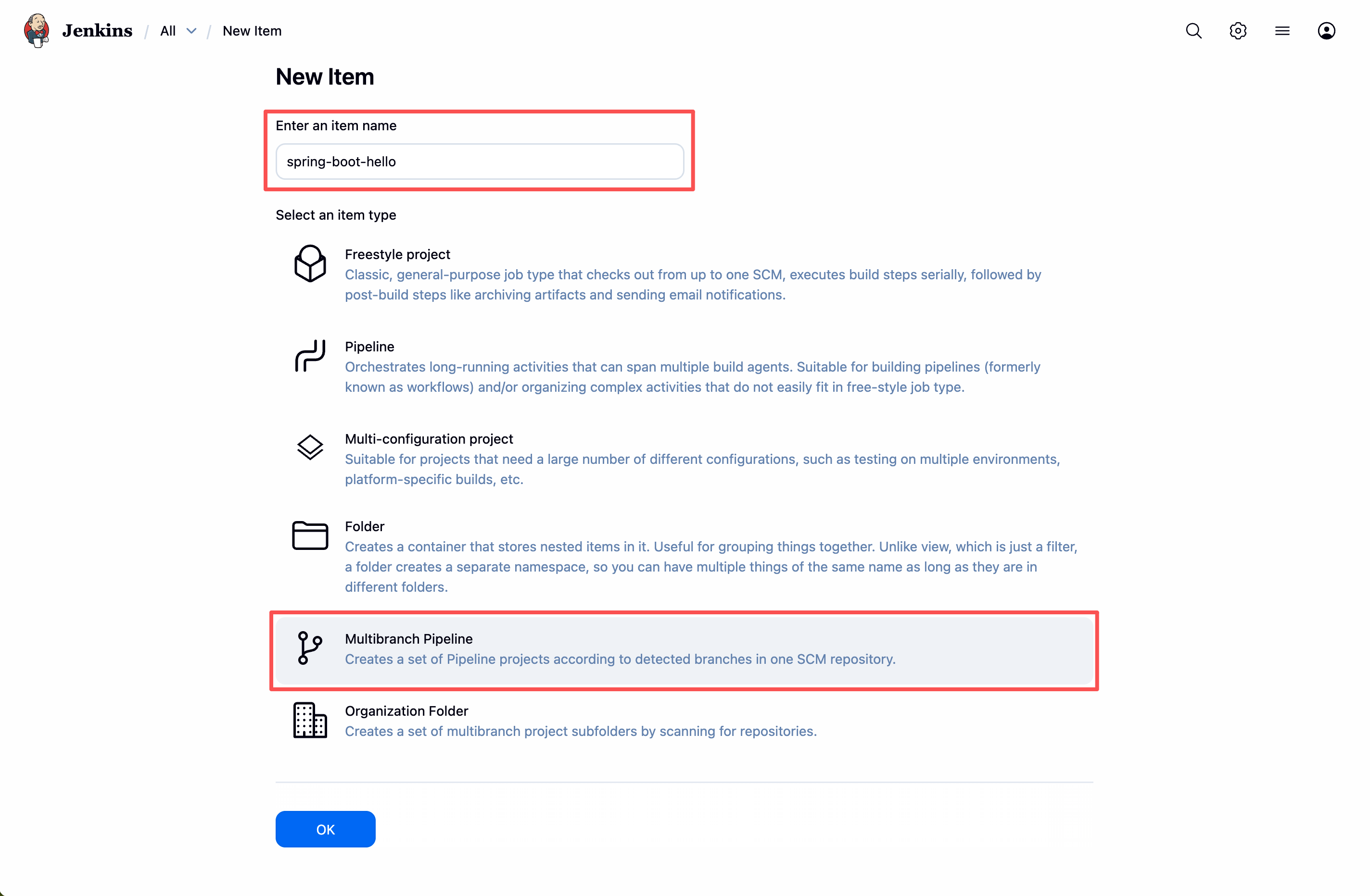 填写 Name,选择 Multibranch Pipeline