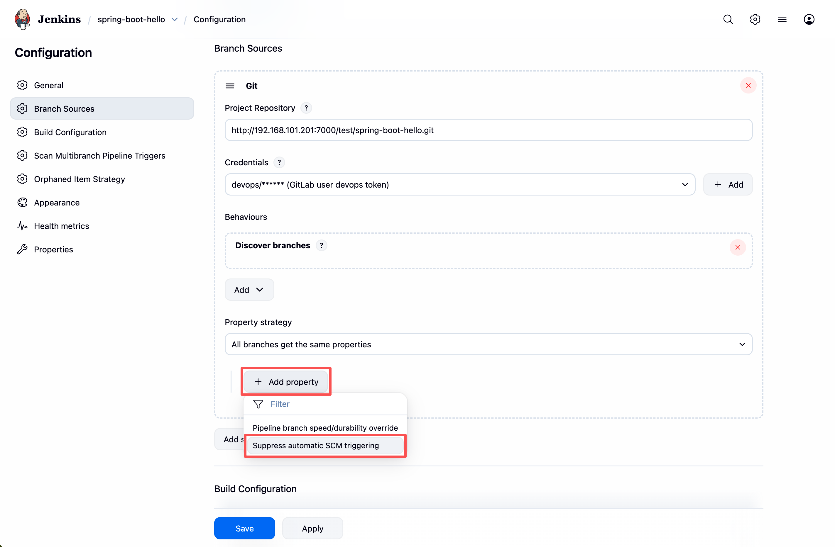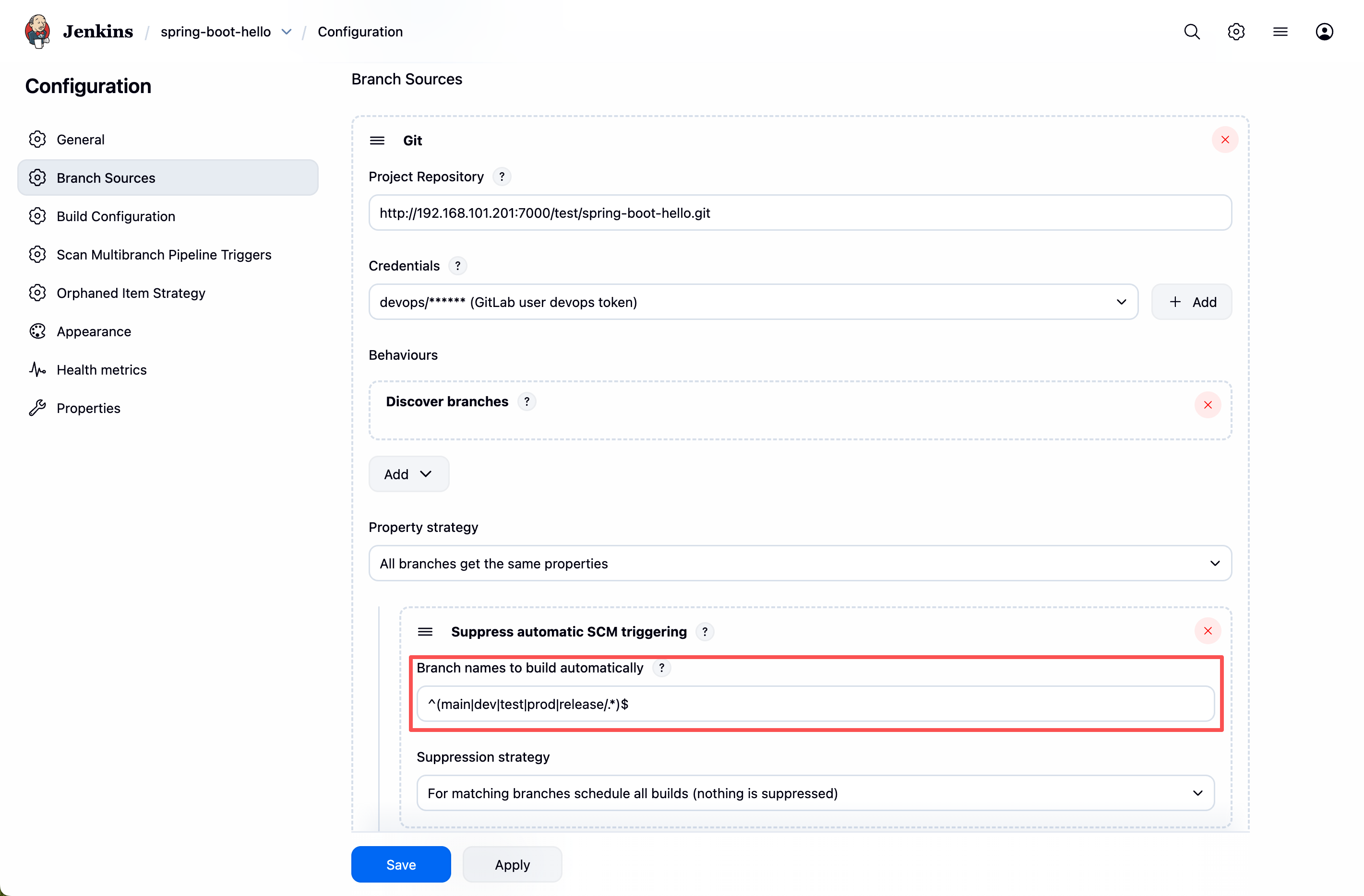 H 0 * * *表示每天凌晨执行)同样可以达到定时扫描的效果。 - 触发方式区别:这里的配置仅用于触发 SCM 分支扫描(发现新分支或提交),具体的构建(Build)是由扫描到变化后的 Branch Source 触发。