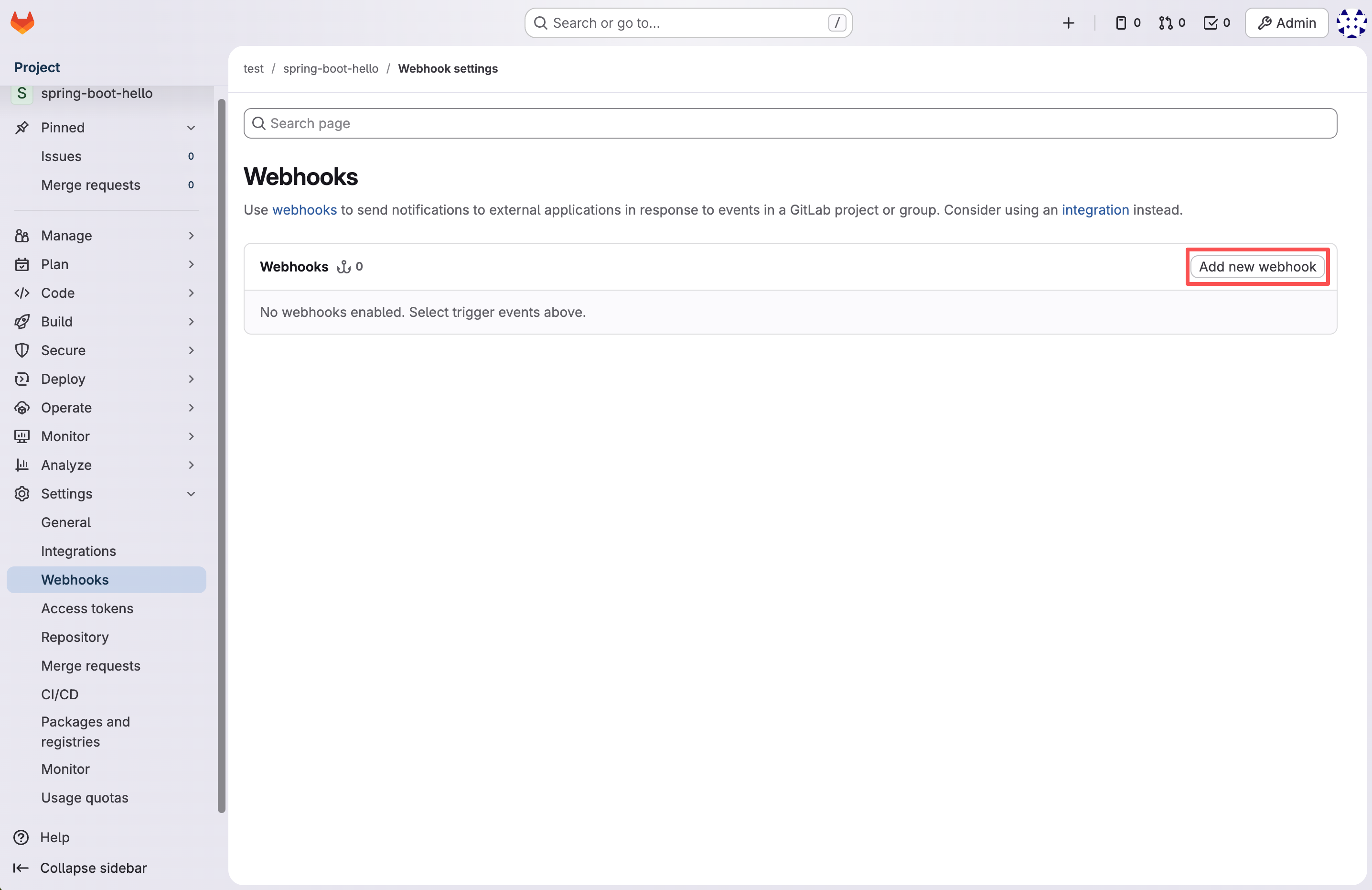 登录 GitLab,进入项目,点击 Settings -> WebHooks