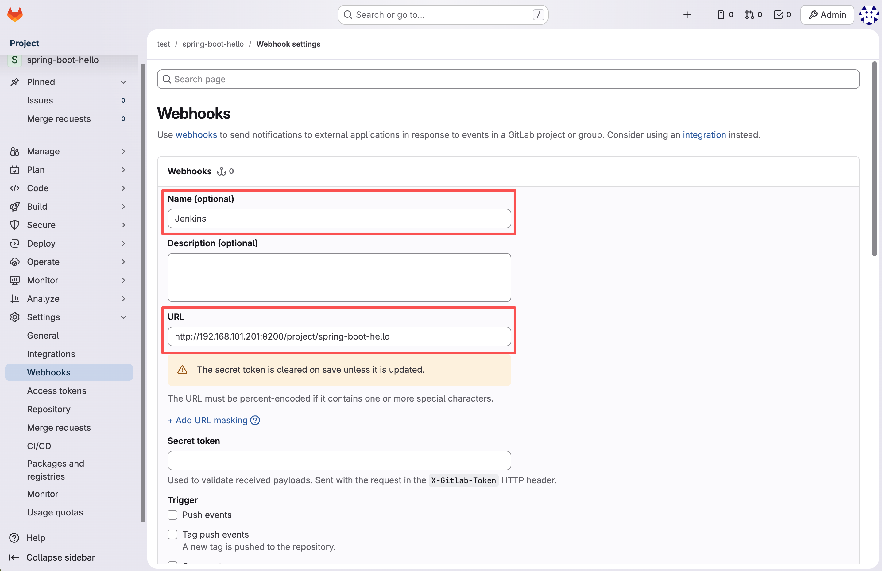 - 如果配置 Secret Token,则需要在 Jenkins 中配置前面提到的 Scan by webhook