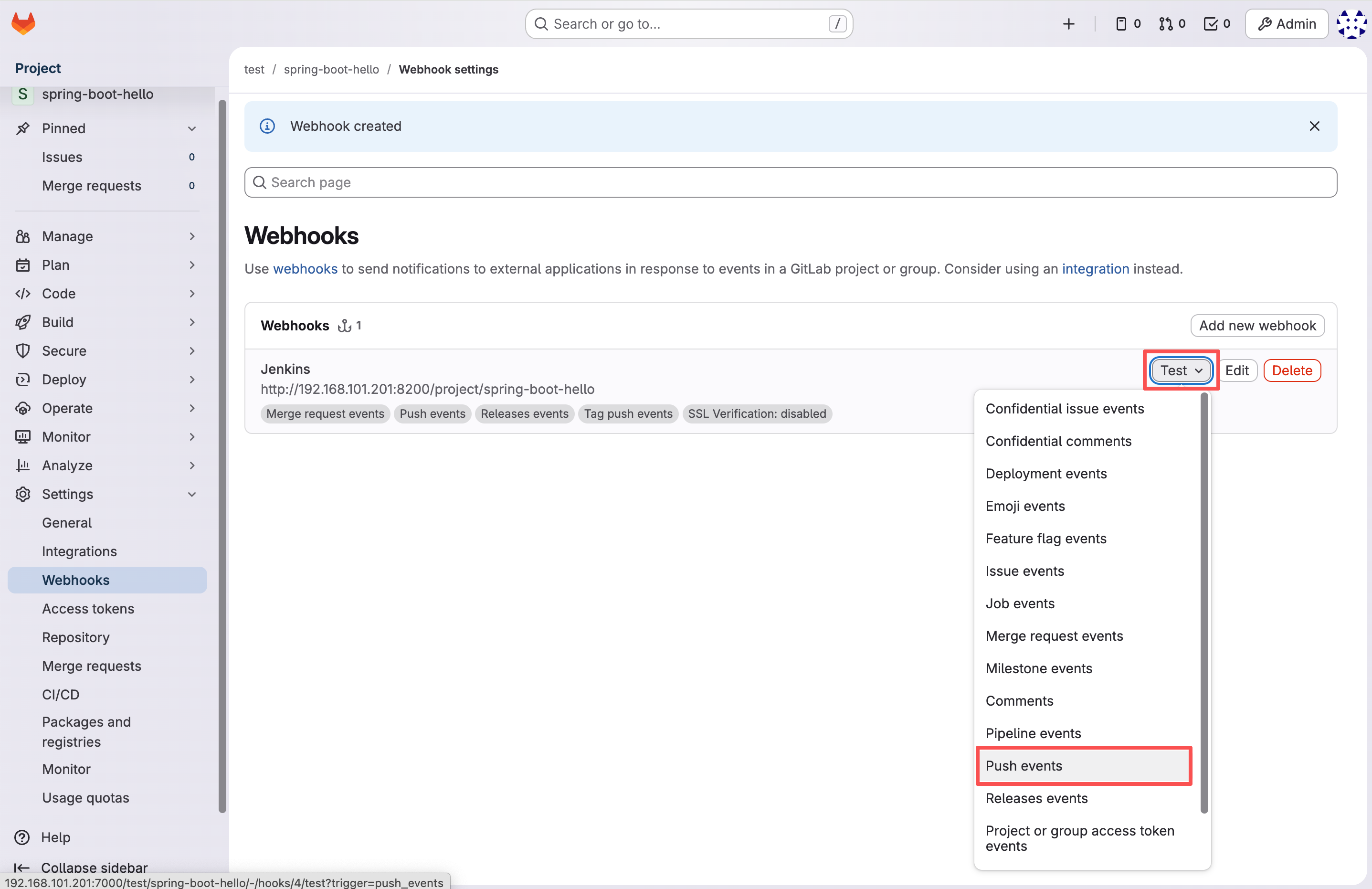 spring-boot-hello 在 浏览器中的 URL 是 http://192.168.101.201:8200/job/spring-boot-hello/,webHook 的 URL 则是 http://192.168.101.201:8200/project/spring-boot-hello
