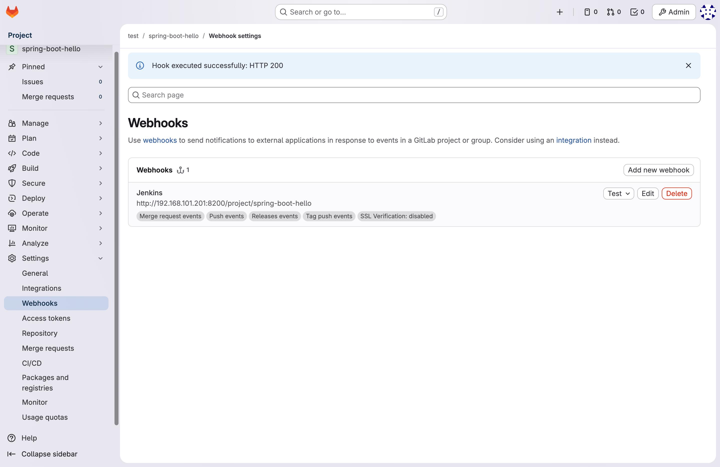 测试成功,提示 Hook executed successfully: HTTP 200,说明 GitLab 和 Jenkins 配置成功。